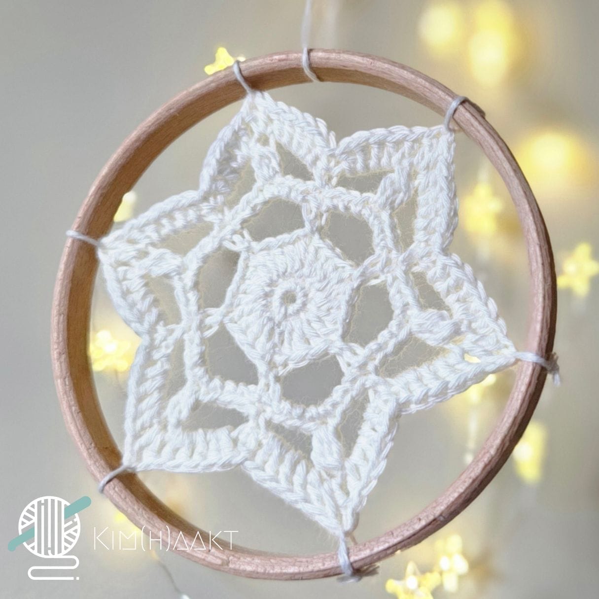 Met dit gratis haakpatroon kan jij een eenvoudige kerstster haken. Hang ‘m zo in de boom, of maak ‘m vast in een ring.